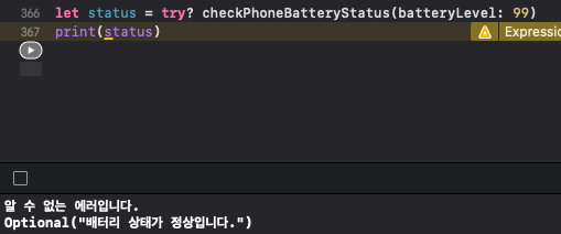 휴대폰의 배터리 상태를 확인하는 함수를 하나 정의하였다. 이 때, 파라미터가 오는 자리 뒤에 throws 키워드와 그 반환값을 정의할 수 있다. 앞서 배운 guard문을 활용해서 반환할 경우를 작성해보았는데, 다시 복기해보자면 ...