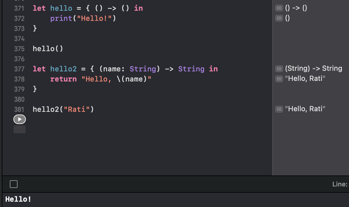 hello에 할당된 클로저는 파라미터와 리턴값이 없는 클로저, hello2에 할당된 클로저는 파라미터와 리턴값이 있는 클로저이다.