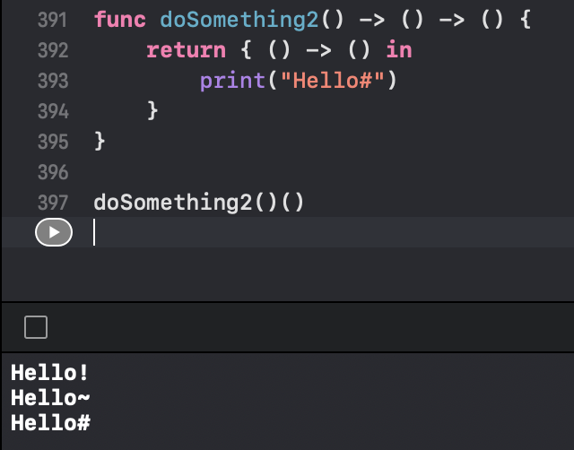 반환하는 클로저가 반환하는 클로저는 아무런 파라미터를 받지 않으면서 Hello# 문자열을 출력하는 print문을 실행한다.