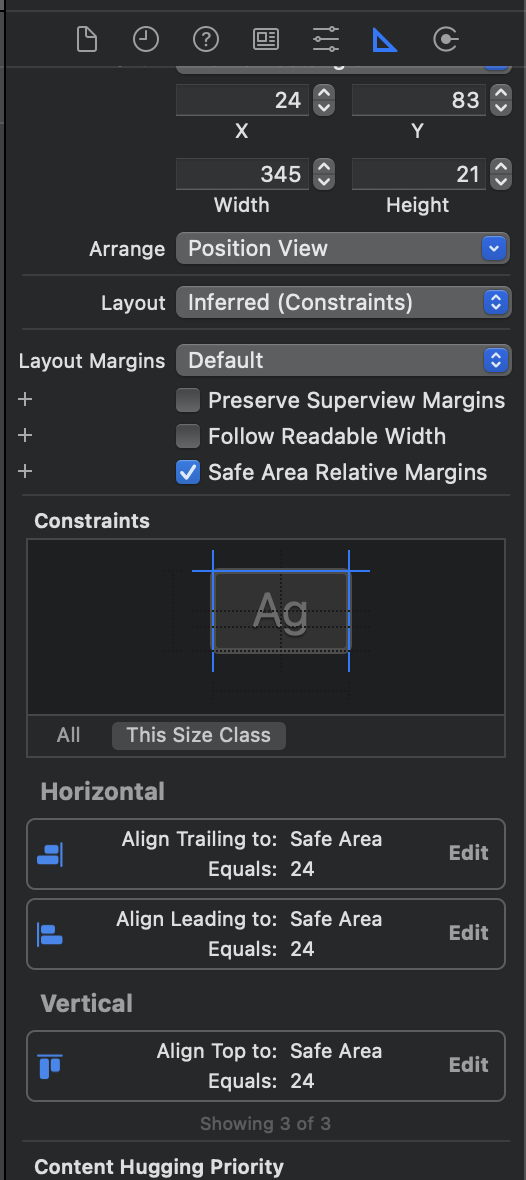 네개 방향에 대해 간격(Margin) 제약조건을 설정할 수 있는데, 이 때 Constraint to margins를 체크하면 기본 간격 값을 포함해서 Margin 값을 주게 되므로 체크를 해제하고 주도록 하자.