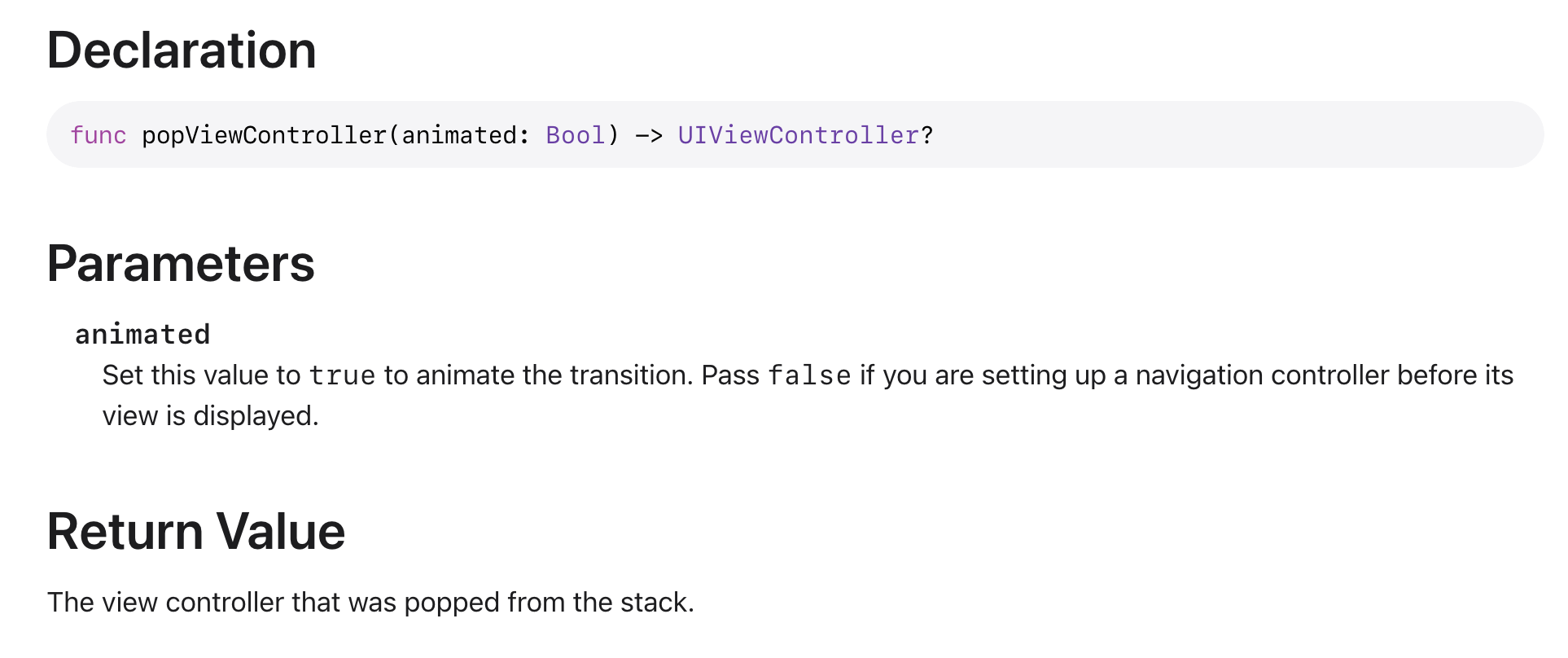 특정한 VC로 전환하는게 아니라 단순히 이전 VC로 돌아가는 것이기에 해당 파라미터만 존재하지 않고, 나머지는 present 메소드와 동일하다.