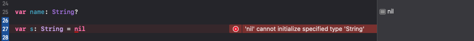 따라서 위 코드는 "'nil' cannot initialize specified type 'String'"이라는 에러를 발생시킬 것이다.