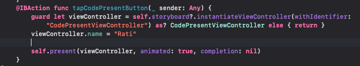 이렇게 각 타입에 맞는 VC로 다운캐스팅해주면, Root View Controller에서 전환될 두 VC에 정의한 name 프로퍼티에 접근할 수 있게 된다. 위 tapCodePushButton, tapCodePresentButton 메소드에서 간단하게 접근할 수 있는 것이다.