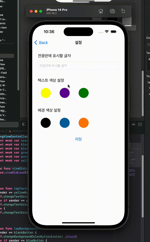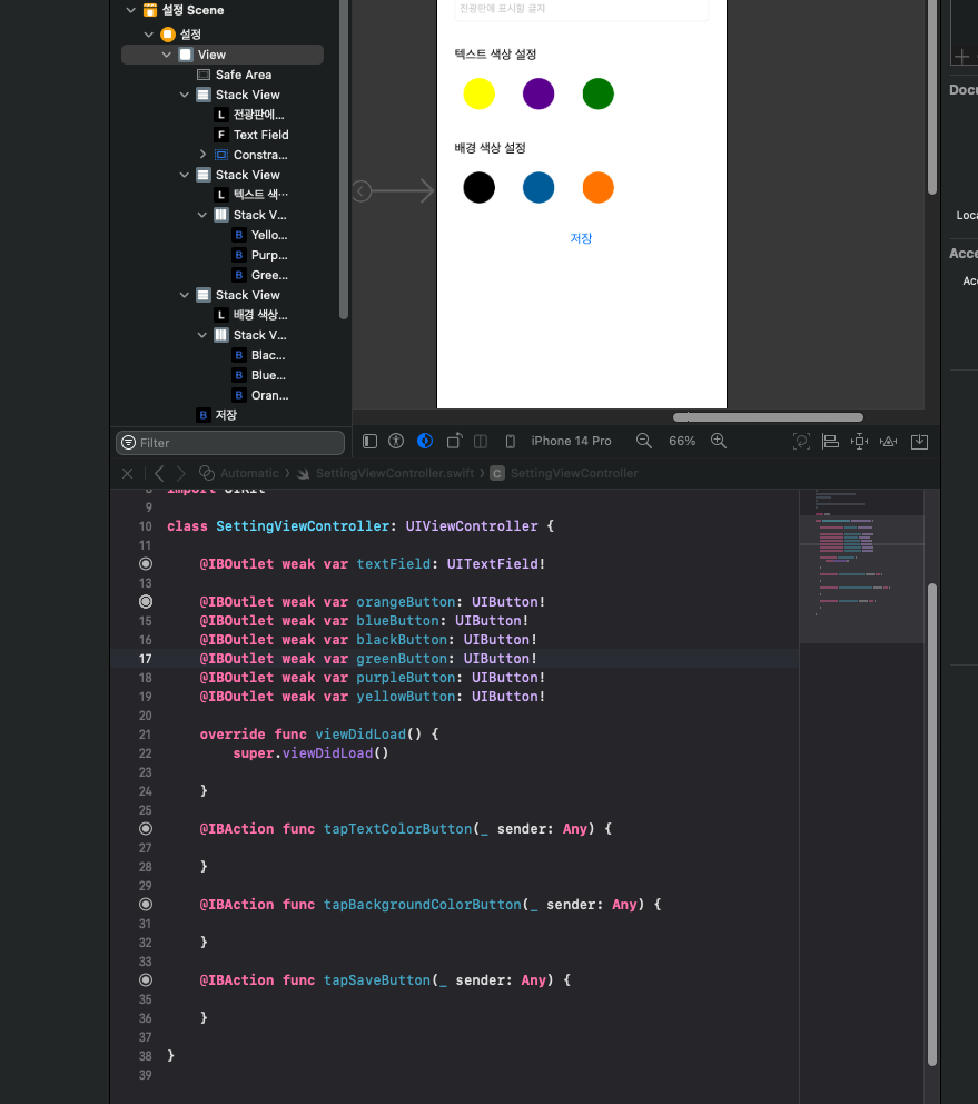 그리고 색상 버튼을 눌렀을 때의 기능 수행을 위한 tapTextColorButton, tapBackgroundColorButton Action 함수와,