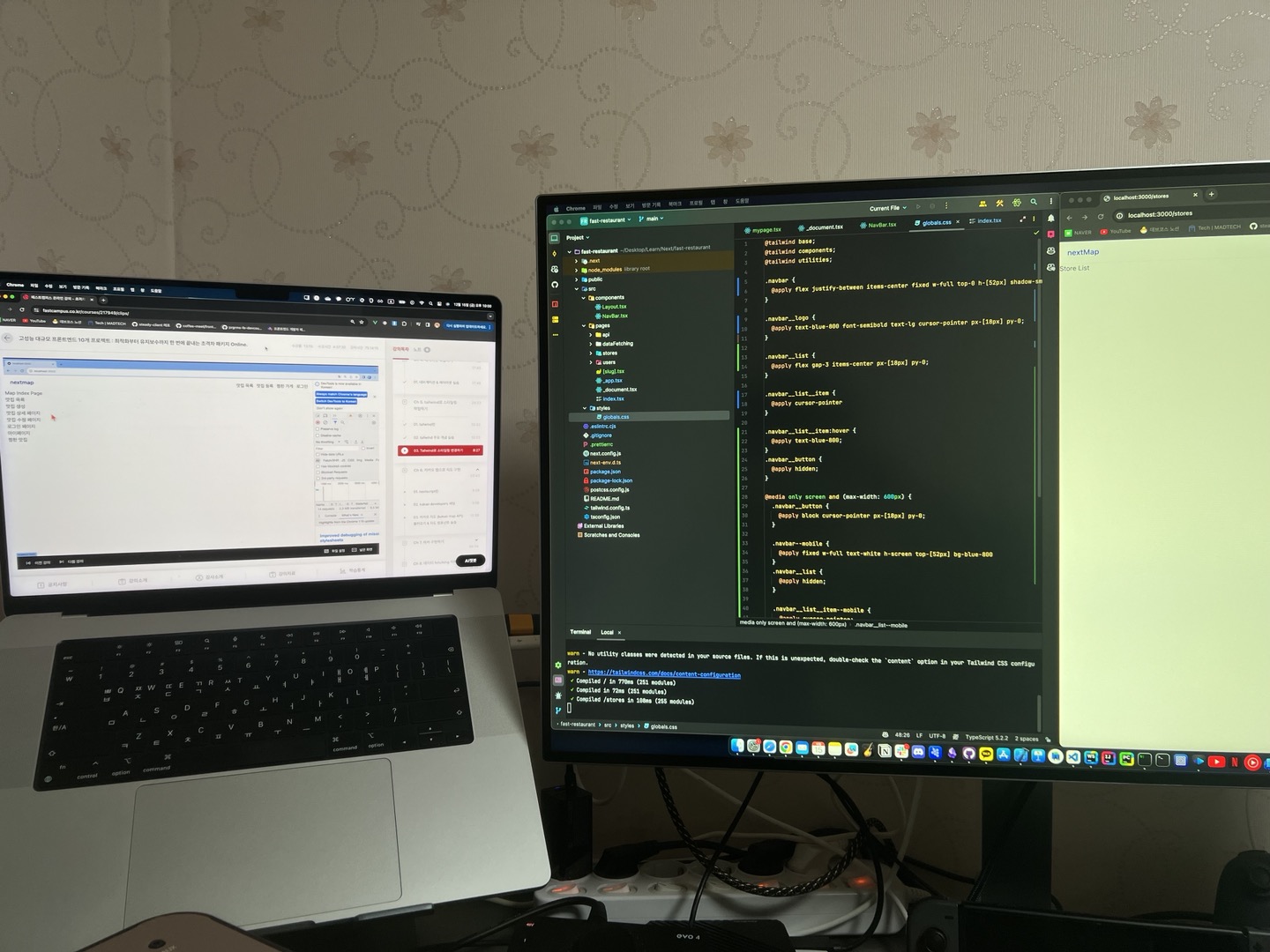 프론트엔드 학습 과정이 보통은 그렇다. 강의 화면보고 코드 똑같이 작성해보고 -> 그 결과를 브라우저에서 확인해보고, 뭐 이런식으로 공부하게 된다. 나는 그래서 이렇게 메인 모니터에서 코드 에디터와 브라우저를 1:1 비율로 나눠놓고, 맥북 화면에 강의 화면을 띄워두고 공부했다. 그런데 이 강의는 나의 경우처럼 메인 모니터가 넓은 편이 아니라서 2개의 뷰를 띄우기는 곤란한 수강생분들까지 배려했던걸까? 강의 안에서도 코드 에디터와 브라우저를 1:1 비율로 나눠놓고 진행되는 편이다. 뭐 이게 이 강의만의 특징은 아니겠지만 그래도 나름 배려를 느꼈던 부분? ㅎㅎ