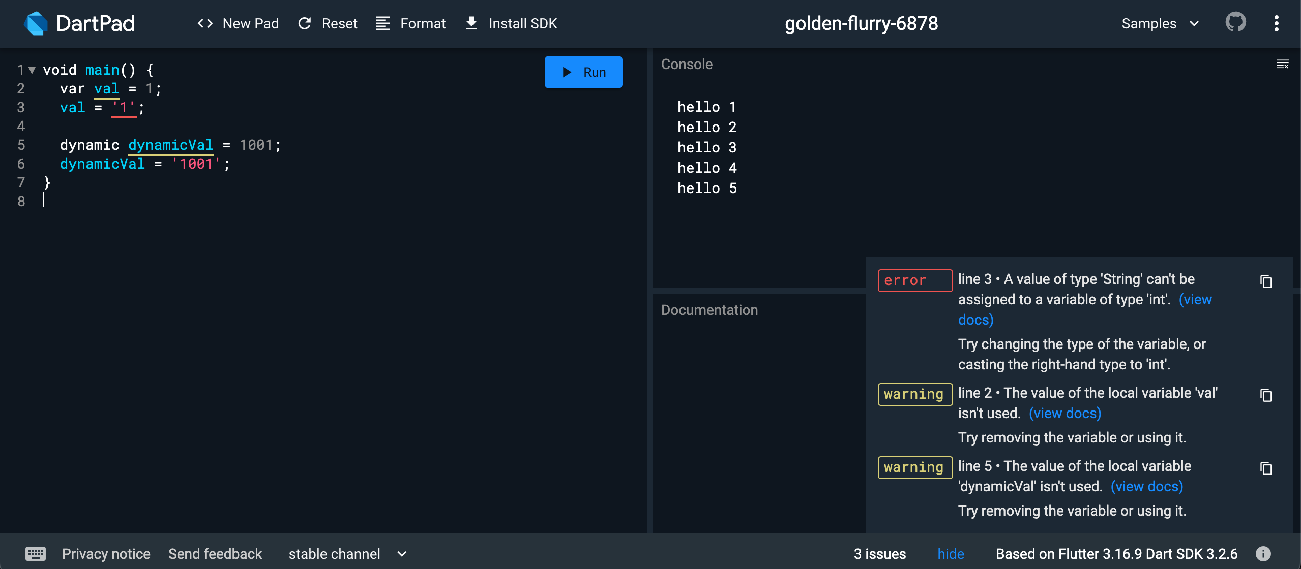 자 그럼 간단하게 Dart를 찍먹해보자. Dart는 타입을 준수하는 언어이지만, 꼭 정의해서 선언할 필요는 없다.
