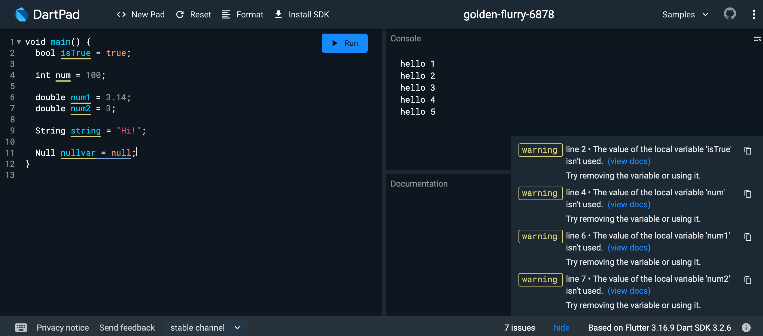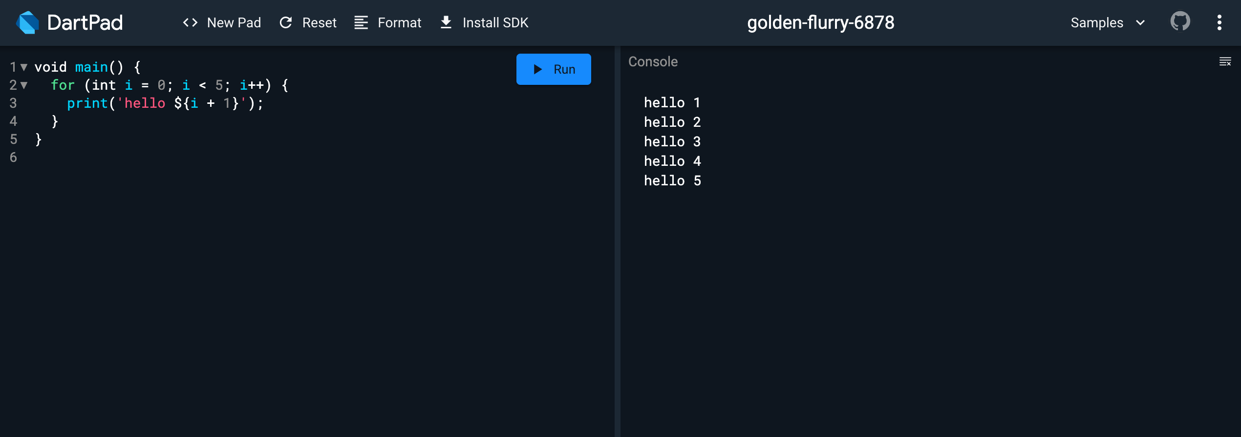 기본적인 Dart 언어 문법을 찍먹하기 위해 Dart Pad를 사용해보자. 아래와 같이 기본 예제 코드가 미리 작성돼있다.
