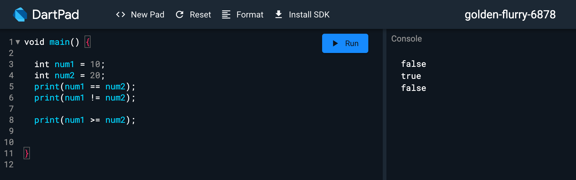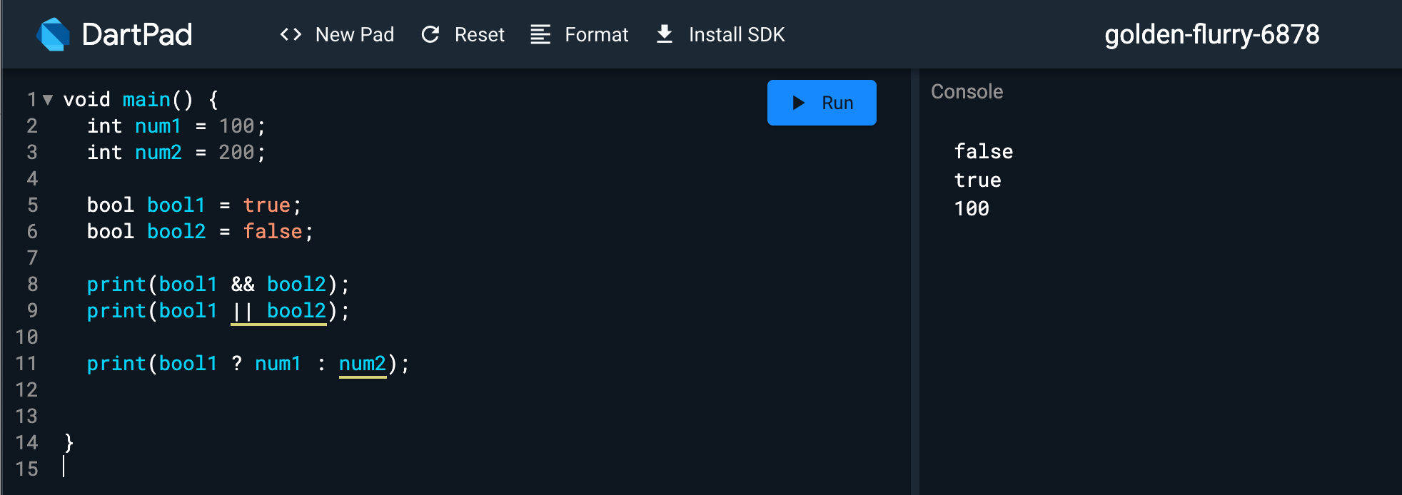 논리연산자(AND, OR)와 삼항연산자도 다른 언어와 동일하게 사용할 수 있다. 애초에 C++, JavaScript, Java, Python과 같은 주류 언어들이 이미 입지를 견고하게 다지고 있는 상황에서 다른 언어들과 너무 다른 성질이 많으면 기존 개발자들을 유입시키기 어려웠을테니 이렇게 다른 언어들의 문법을 그래도 가져와서 사용하고 있는듯 하다. 덕분에 개발자의 입장에서 친숙함을 느끼고 빠르게 Dart에 익숙해질 수 있는 것일테고.