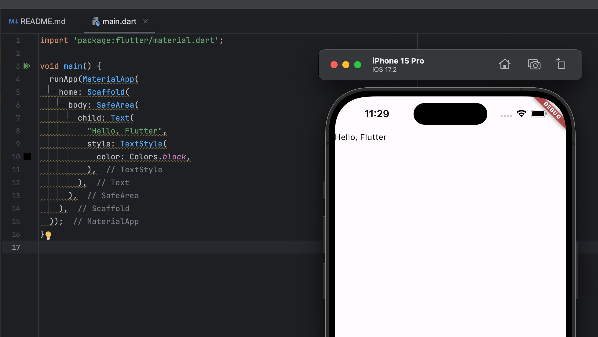 이제 Flutter 기초를 다루기 위한 프로젝트를 생성해주고, main.dart를 싹 비워서 텅 빈 main함수 안에 코드를 작성해보자.