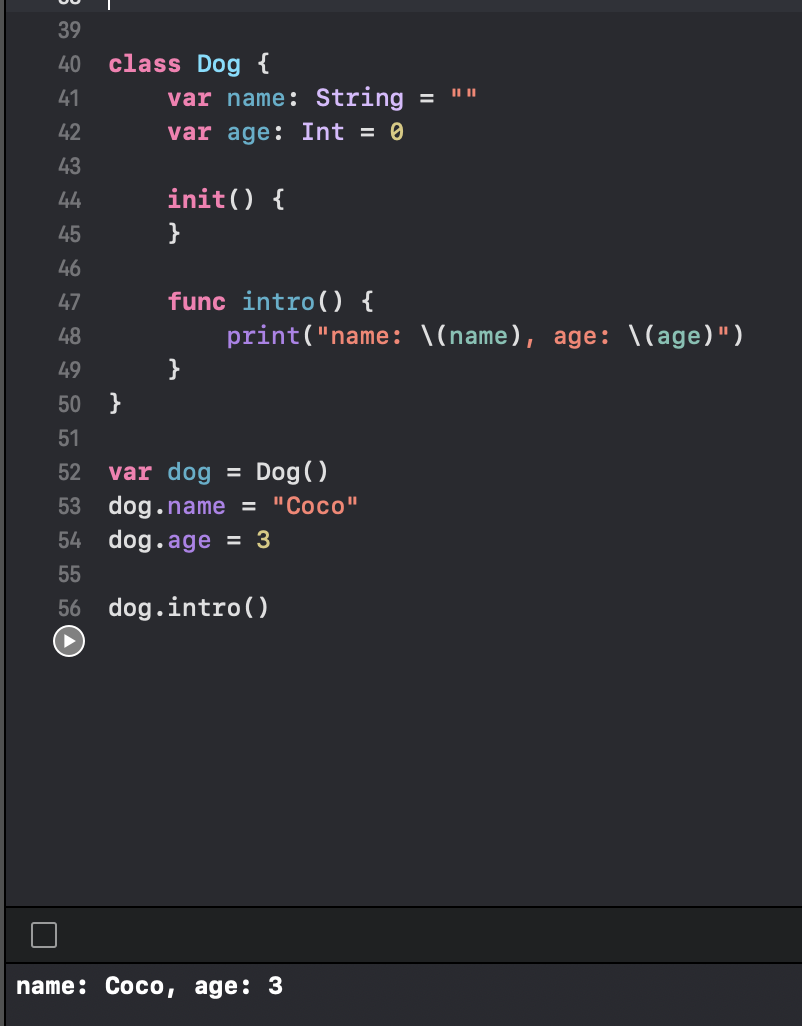 강아지의 이름과 나이 정보를 포함하는 클래스를 작성한 실제 코드를 확인하면 구조체와 차이점을 하나 발견할 수 있다.