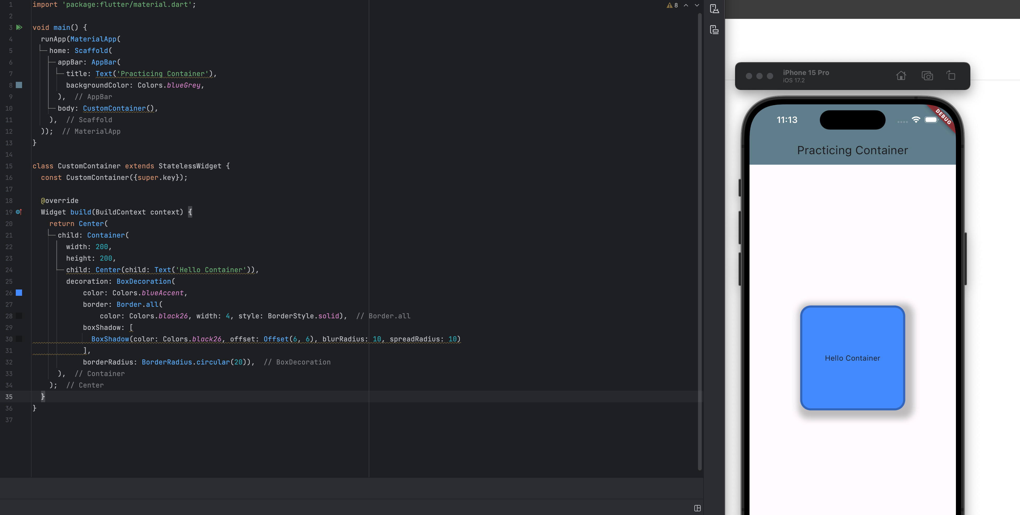 그리고 decoration 속성을 통해 조금 더 세밀한 스타일 조정도 가능한데, color 속성과 중복해서 사용할 수 없으므로 둘 중 하나만 사용하자. 아래 사진은 Container를 중앙 정렬하고 테두리 스타일을 추가한 다음에 그림자 속성까지 추가해본 결과이다.