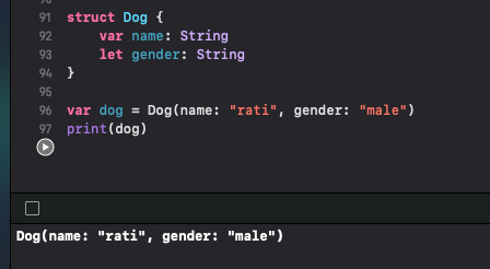 그리고 dog라는 이름의 Dog 구조체 인스턴스를 선언함과 동시에 각 프로퍼티를 초기화해주는 코드이다.
