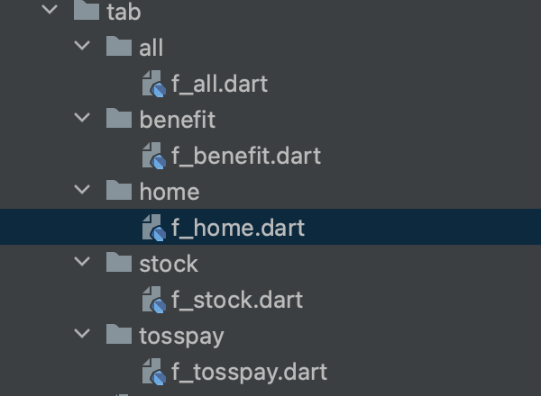 아래 all, benefit, home, stock, tosspay에 해당하는 Fragment는 파일 네임 컨벤션에 따라 'f_'라는 접두사를 포함시켜주었다.