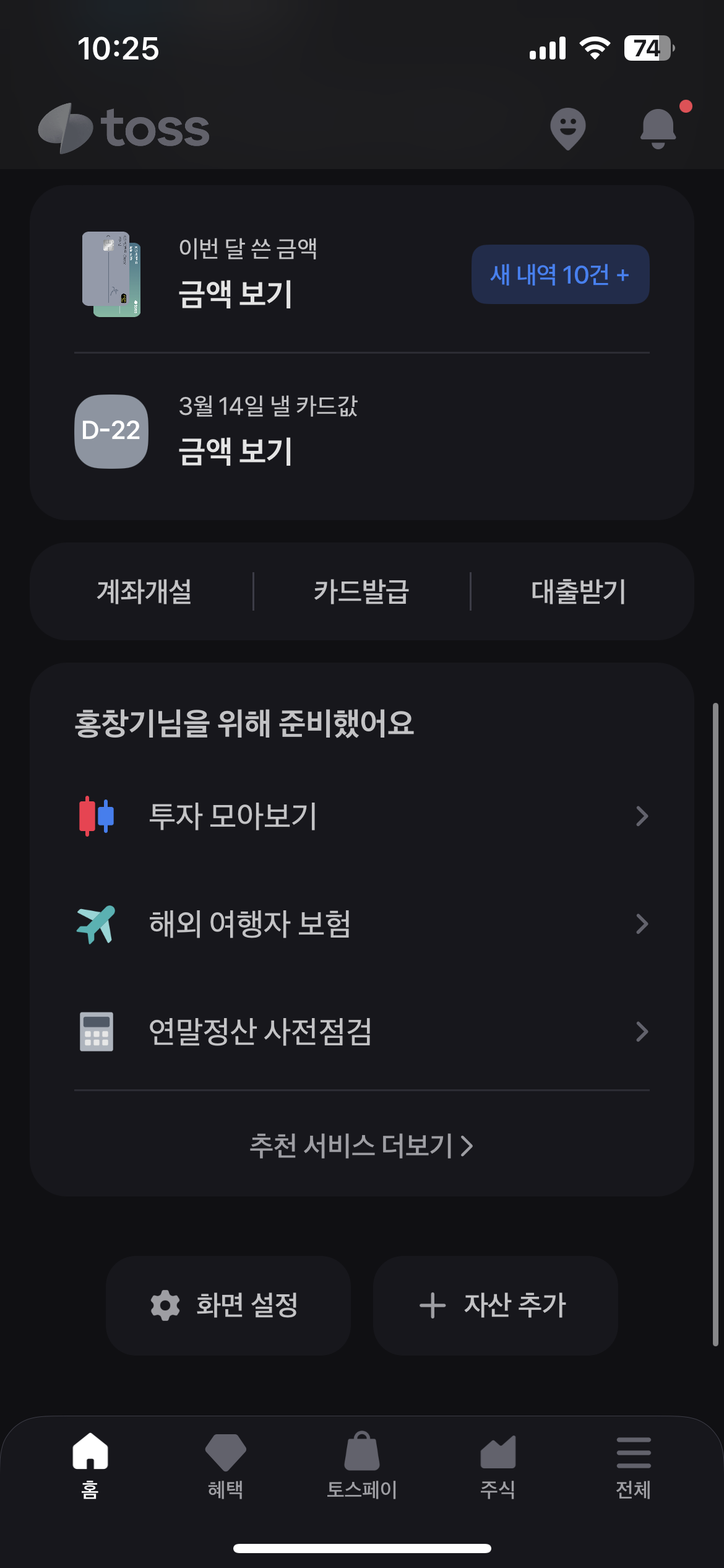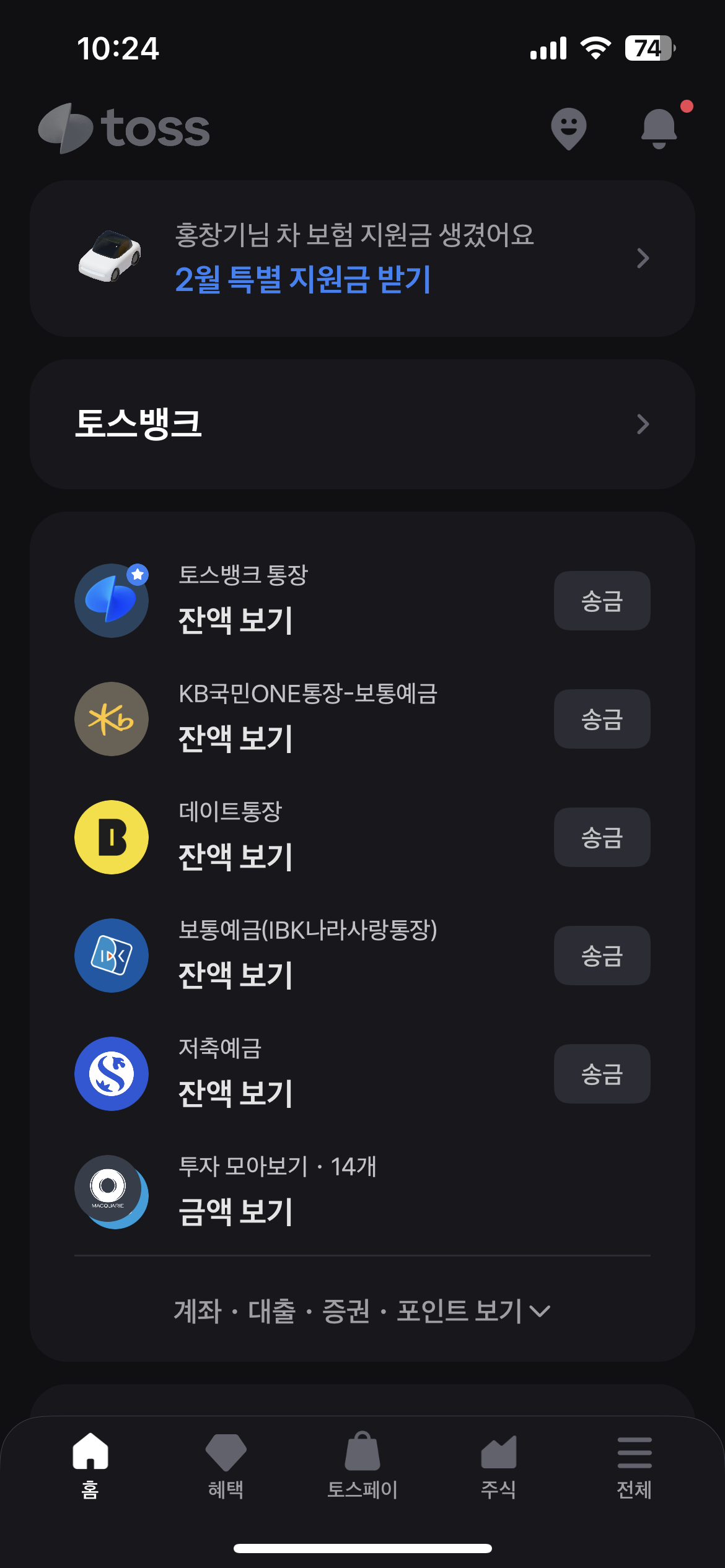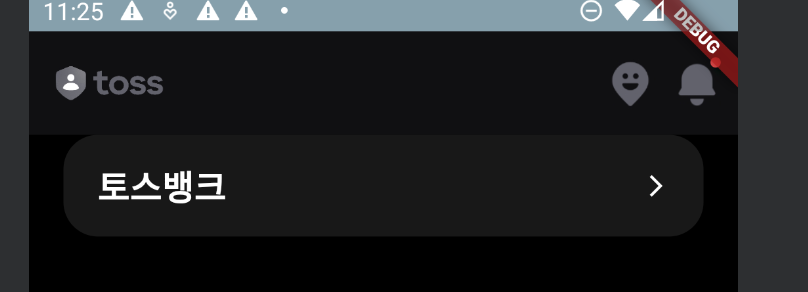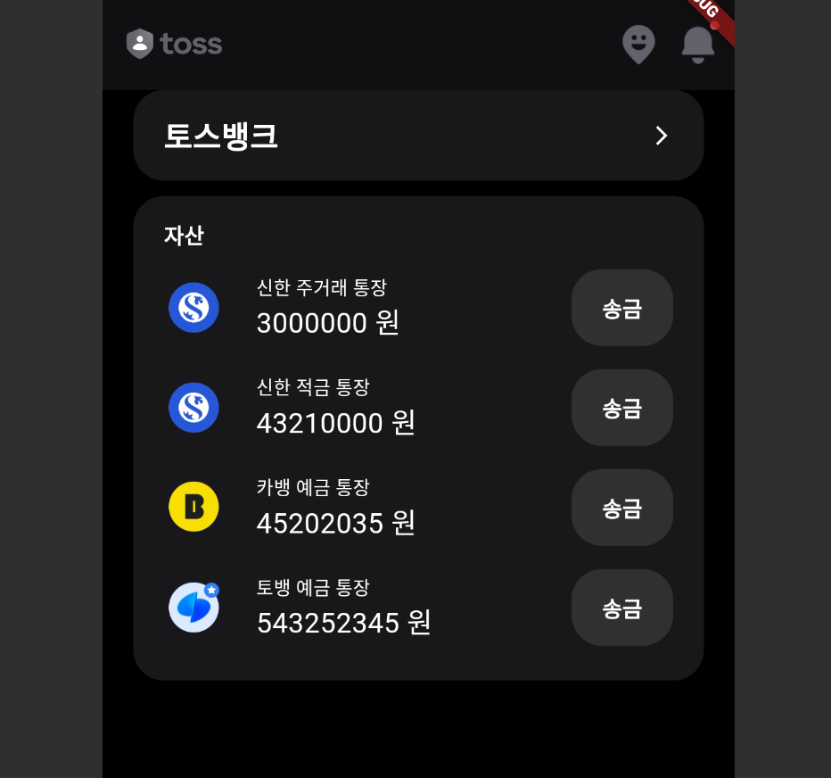 토스뱅크 영역으로 이동하는 버튼은 내부에 포함되는 토스뱅크 Label과 우측의 화살표를 감싼 Row 객체를 child로 받는 컨테이너를 별도의 위젯으로 분리해 재사용성을 높이며 작업했다. 아래는 자산 영역까지 만든 결과이다.
