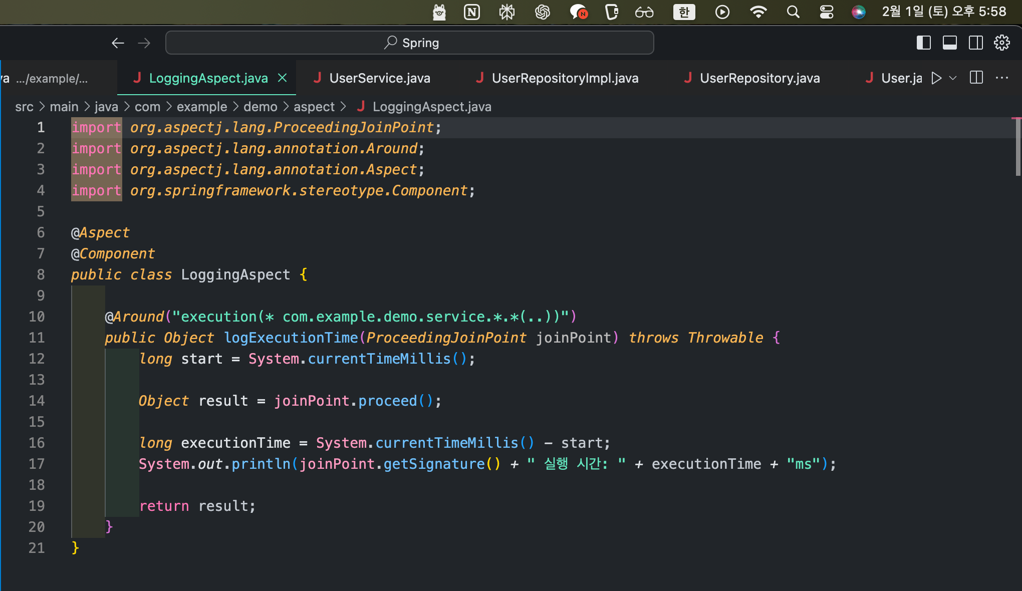 AOP를 이야기할 때 사용하게 되는 Join Point(횡단 관심사가 실행되는 지점), Advice(Join Point에서 실행되는 코드), Pointcut(Join Point 중 Advice를 적용할 곳을 선별하는 표현식), Target(AOP 처리에 의해 처리 흐름에 변화가 생긴 객체) 등의 용어가 있었는데, 실제로 AOP를 적용해보면서 이해하는게 빠를 것 같다.