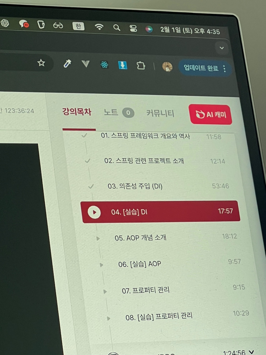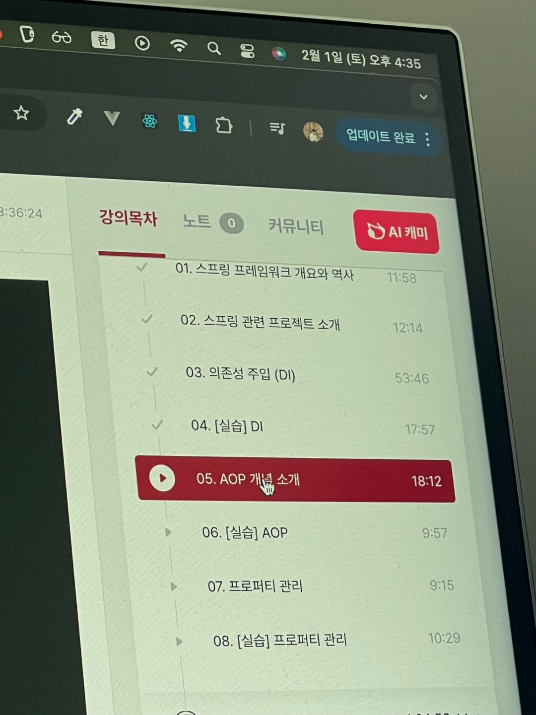 나는 챌린지 시작일 이전부터 강의 수강을 시작했기 때문에, 오늘은 DI 실습 파트, AOP 개념 소개 클립을 보고 공부해봤다.