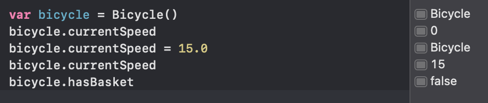Bicycle 클래스의 인스턴스 bicycle을 선언하고, 상속 받은 프로퍼티 currentSpeed를 확인 및 변경해보았다.