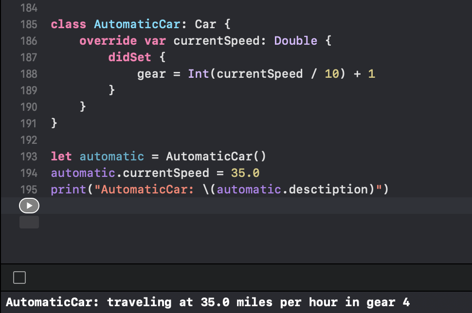 Car 클래스의 currentSpeed를 오버라이딩하고, didSet 옵저버를 통해 currentSpeed의 값에 따라 gear값을 변경하도록 했다.