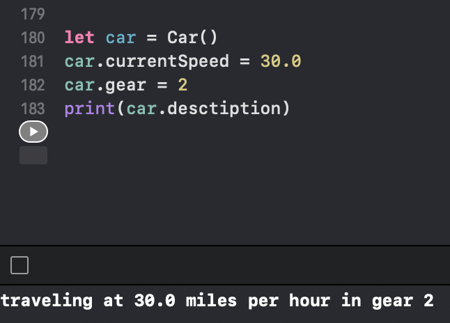 인스턴스 생성 후 currentSpeed에 35.0을 할당한 뒤 gear의 변화값을 확인하기 위해 description을 출력해보았다.