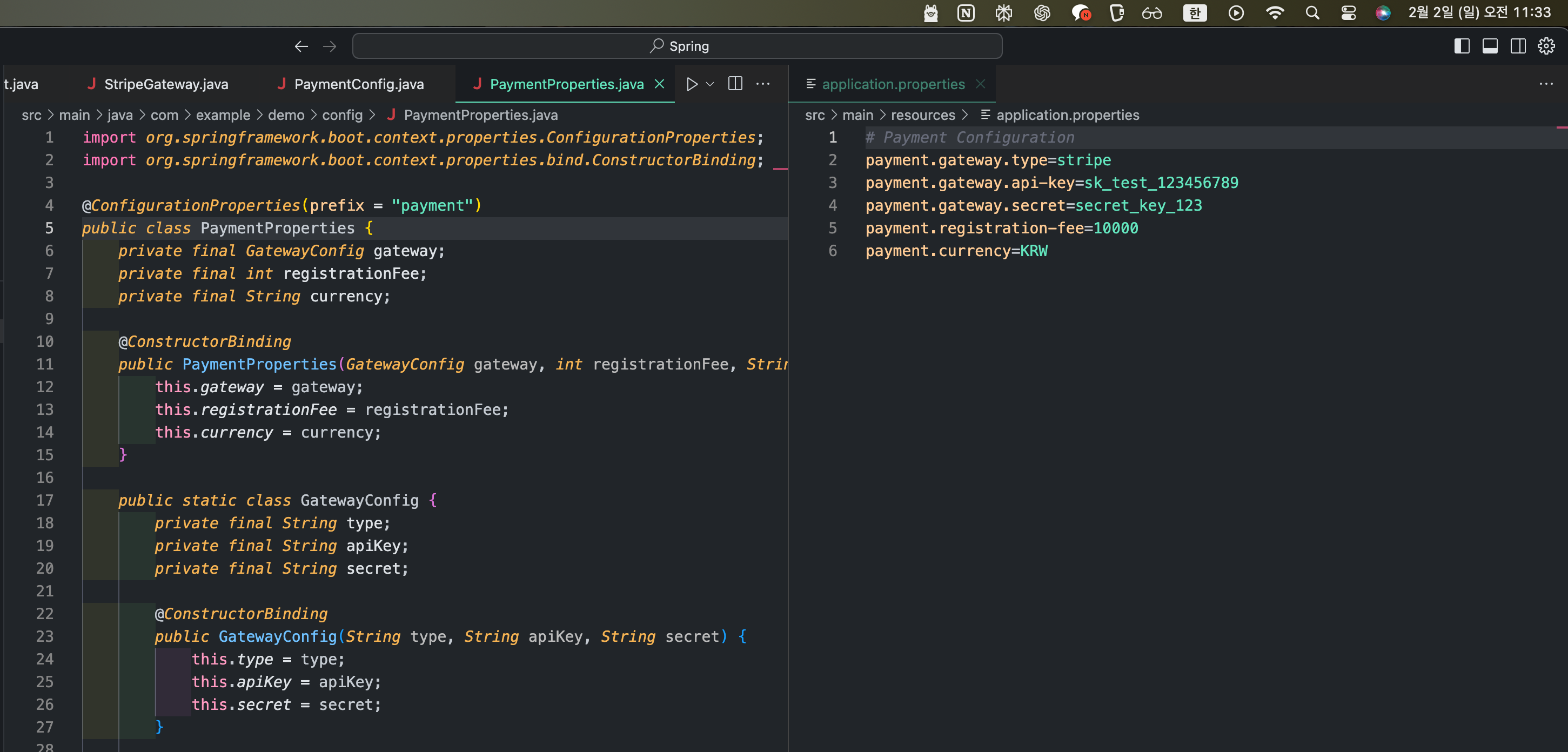 @ConfigurationProperties 어노테이션을 활용해서 특정 prefix로 시작하는 프로퍼티값들을 한번에 불러와서 할당하는 방법도 있는데, 특정 상황에서 매우 유용하게 사용할 수 있을 것 같다.