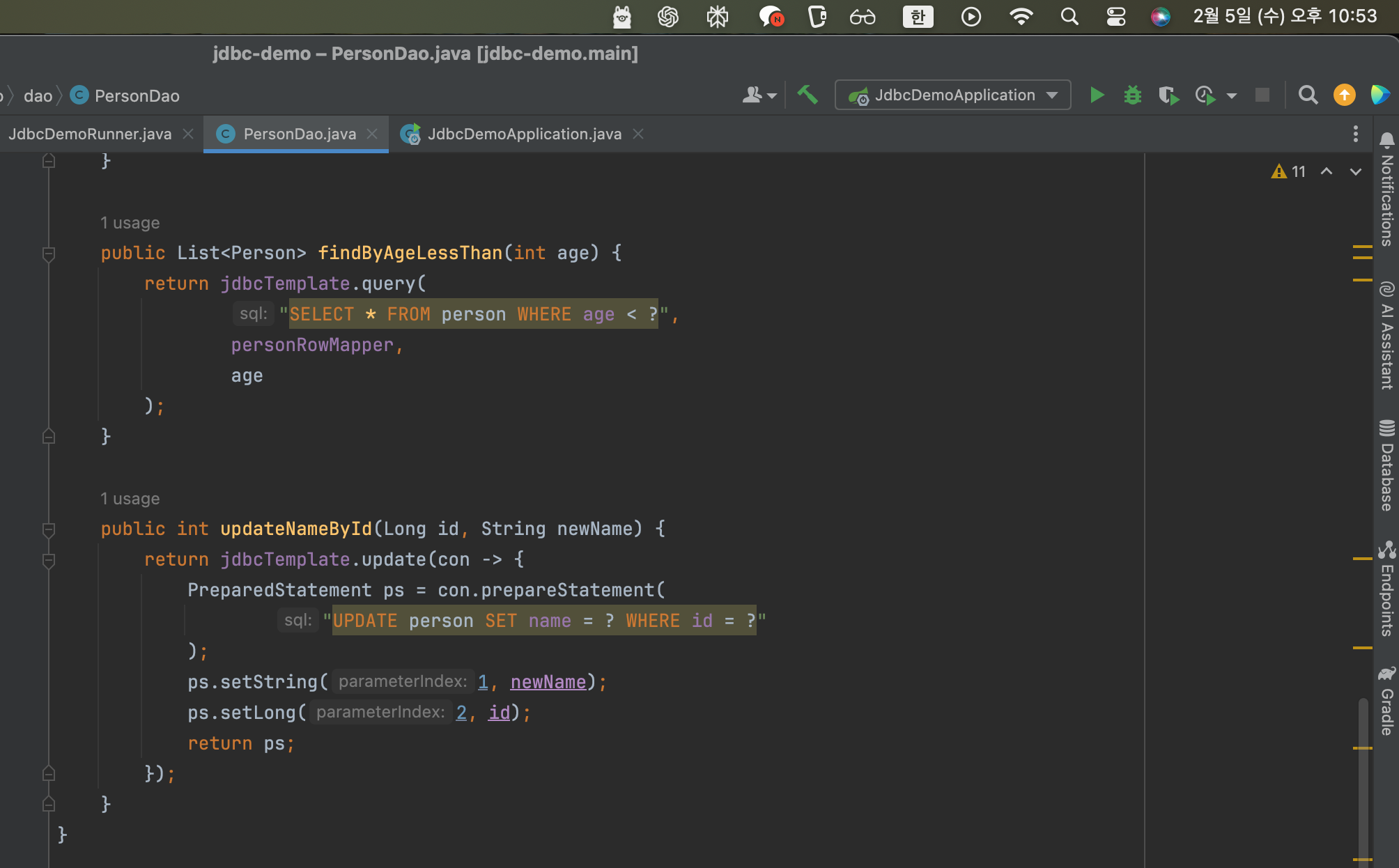 데이터 일괄 처리 자체는 여러 건의 데이터에 대해 SQL 쿼리를 실행하는 것을 의미하지만, 오늘 강의에서는 update() 쿼리에 대해 주로 다루어졌다. 그리고 이전에 공부했던 PreparedStatement를 활용한 쿼리 실행 방법에 대해서도 다루어져서 간단한 실습을 진행했다.