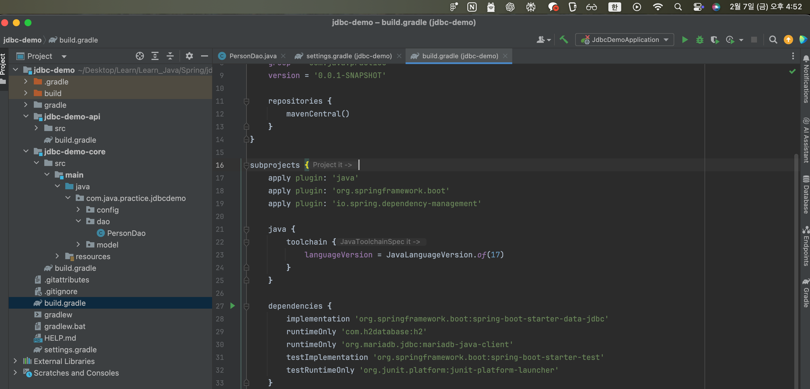 Maven 기반의 중앙 저장소를 지원해서 라이브러리를 설치할 필요 없이 그대로 가져다 사용할 수 있다고 한다. (그럼 프로젝트가 너무 무겁지 않나..?) build.gradle에서 빌드와 관련된 설정을 관리하고, settings.gradle에서 프로젝트 설정을 관리한다.(Multi Module Project를 구성할 때도 settings.gradle을 활용한다)