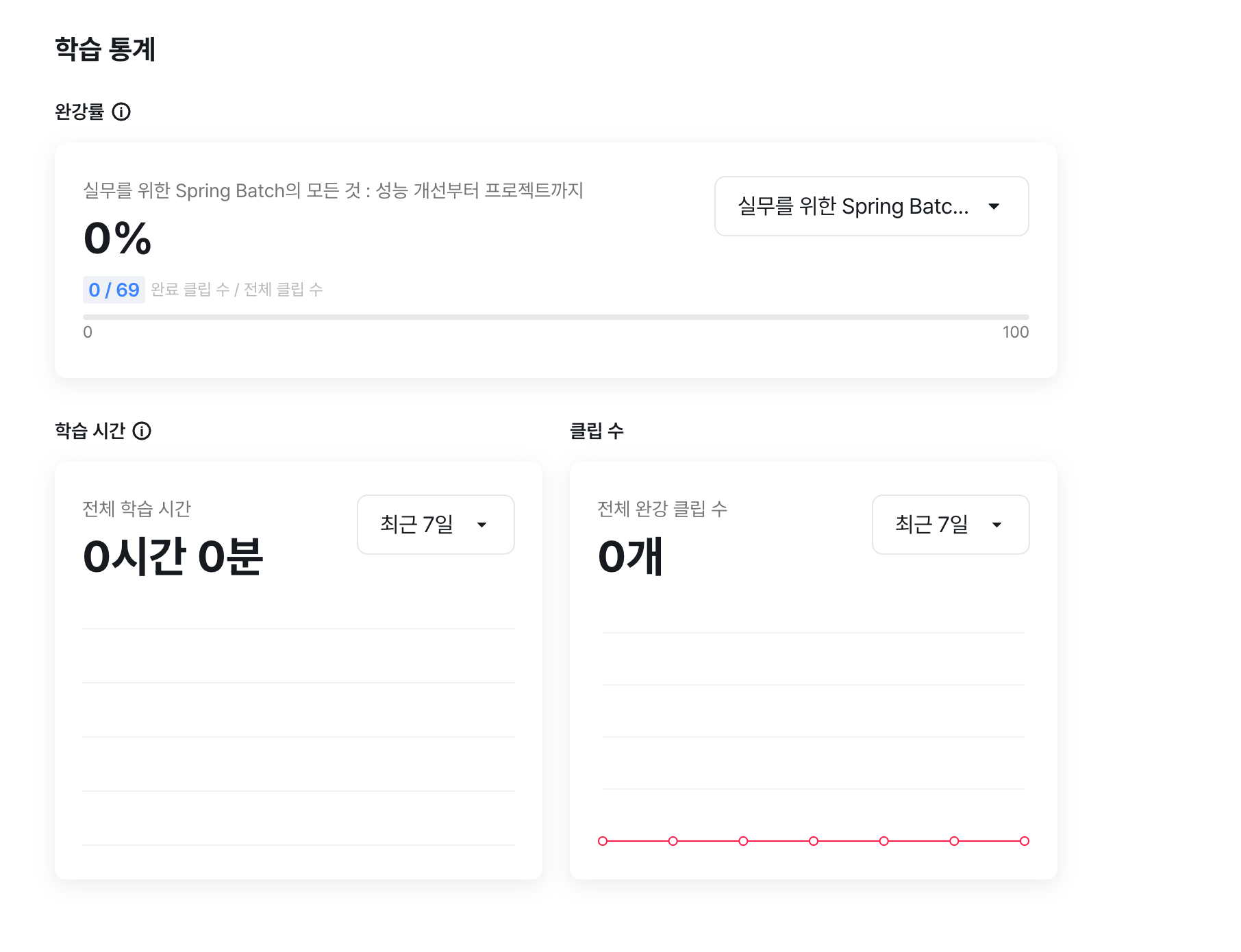 그런데 글을 작성하는 지금은 해당 강의가 만료가 돼서 그런지, 수강률과 완료 클립 개수가 모두 0으로 표시되고 있다 ㅠ 이런...