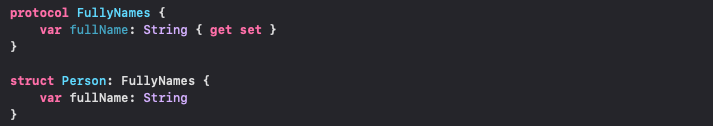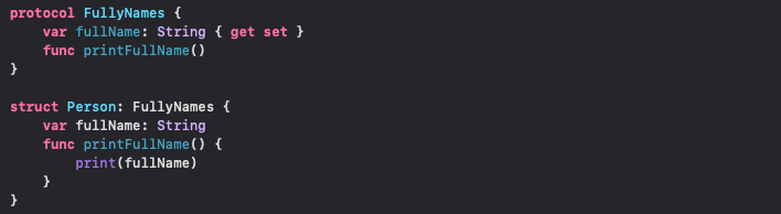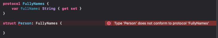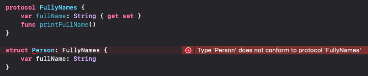 프로토콜에 정의된 fullName 프로퍼티가, 프로토콜을 준수하는 Person 구조체에 정의되어있지 않아서 컴파일러는 에러를 띄운다.