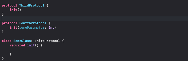 프로토콜에서 요구하는 생성자 함수를 타입에서 정의할 때에는 생성자 함수 앞에 required 키워드를 붙여줘야한다.