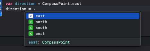 또한 direction 인스턴스를 선언하고 열거형 내부 항목을 할당해주면, 그 때부터 해당 인스턴스는 열거형 타입으로 추론되어