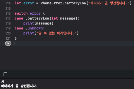 위에서 작성했던 switch 구문에 문자열 대신 rawValue 프로퍼티를 이용하여 인스턴스의 원시값을 출력하도록 했다.