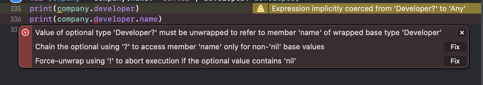 Company 구조체의 developer 프로퍼티의 타입이 옵셔널이기 때문에 그것을 해소(옵셔널 바인딩)시켜줘야한다는 것이다.