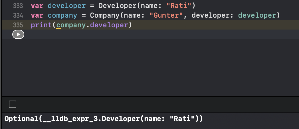 인스턴스를 생성할 때 developer에 파라미터를 넘겨줄 수 없다. 따라서 nil을 넘겨받은 company 인스턴스의 developer 프로퍼티의 값을 출력해보면 nil이 출력된다.